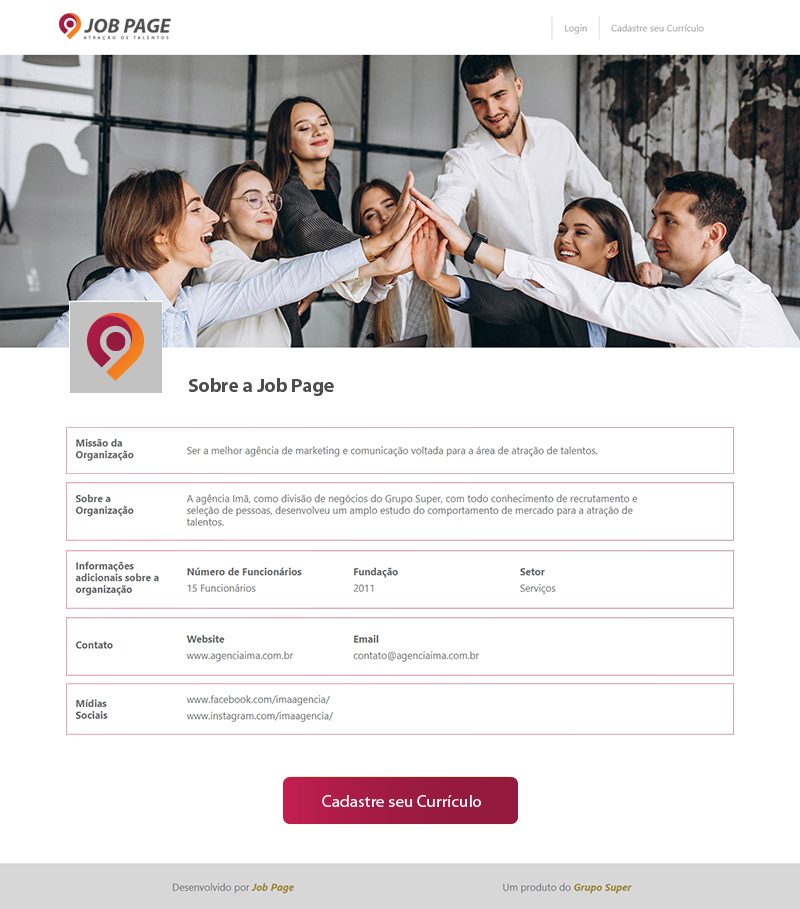 Com a nossa Job Page personalizada você poderá anunciar as vagas disponíveis na sua empresa, aumentando assim as chances de conseguir o candidato ideal para as vagas disponíveis.